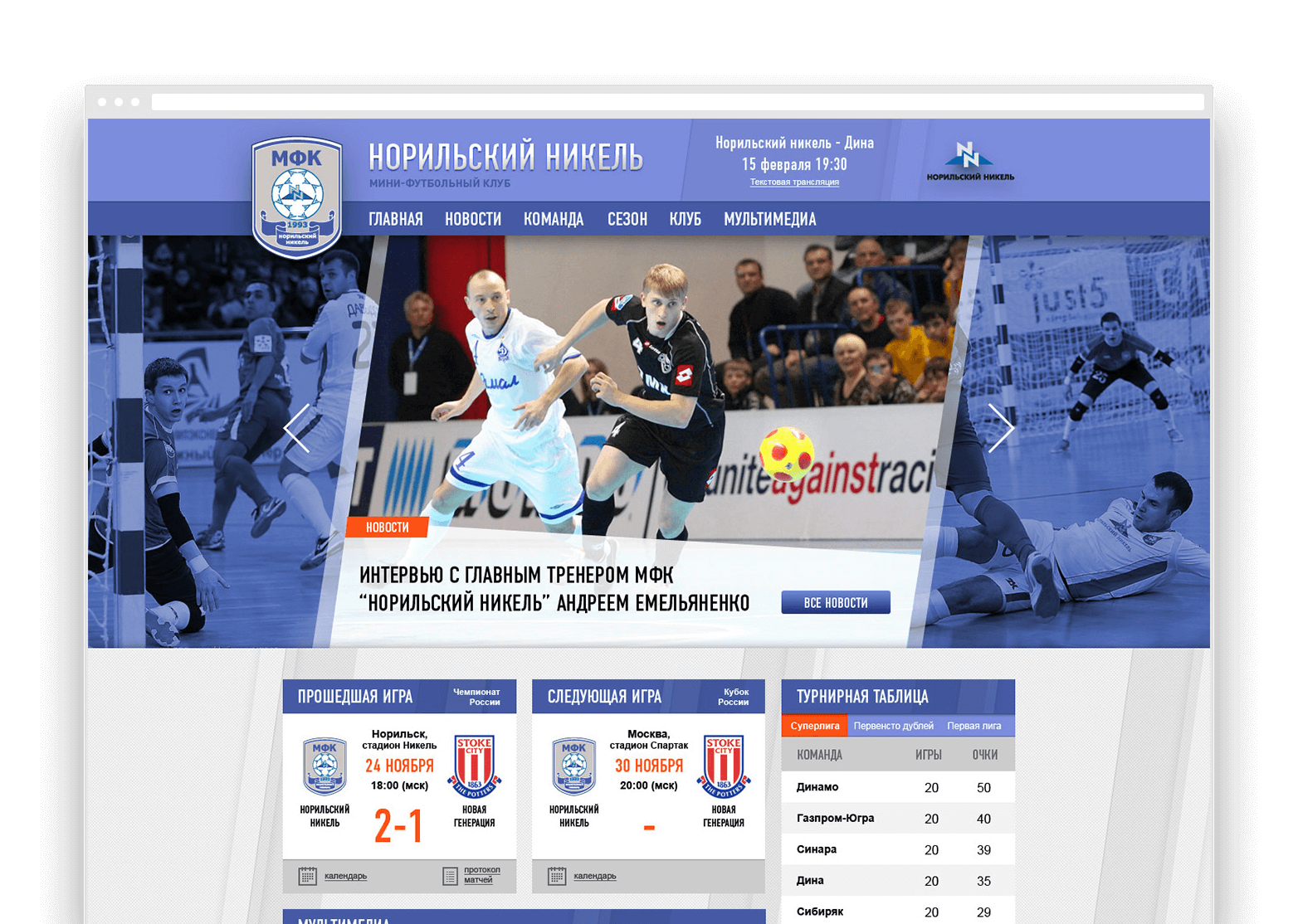Дизайн сайта мини-футбольного клуба «Норильский никель»